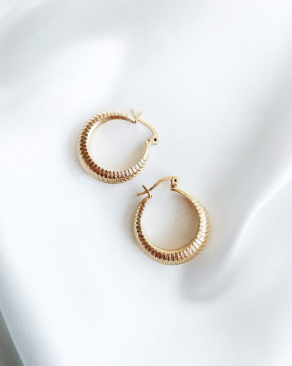 Klasiški, išskirtiniai hoops auskarai su vingiuotu raštu. Sudėtis: 24k paauksuotas žalvaris.