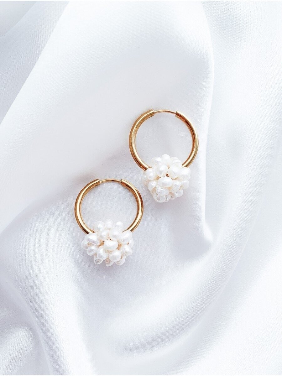 Puošnūs nerūdijančio plieno auskarai (hoop earrings) su perliukų kamuoliuku.