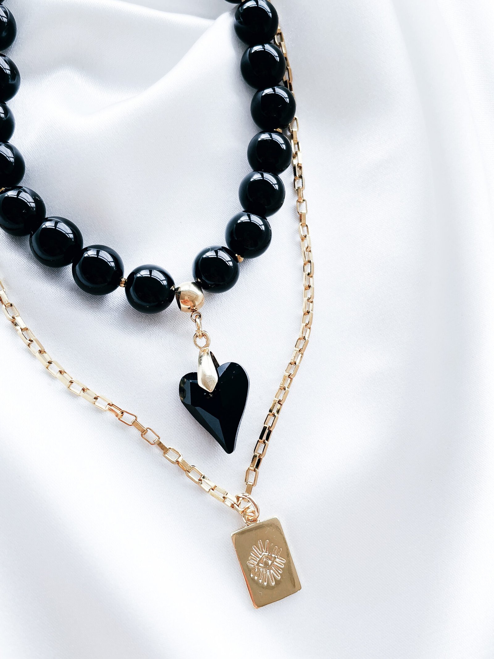 * Onikso vėrinys, dekoruotas smulkiais hematito akmenėliais ir swarovski kristalo širdele.