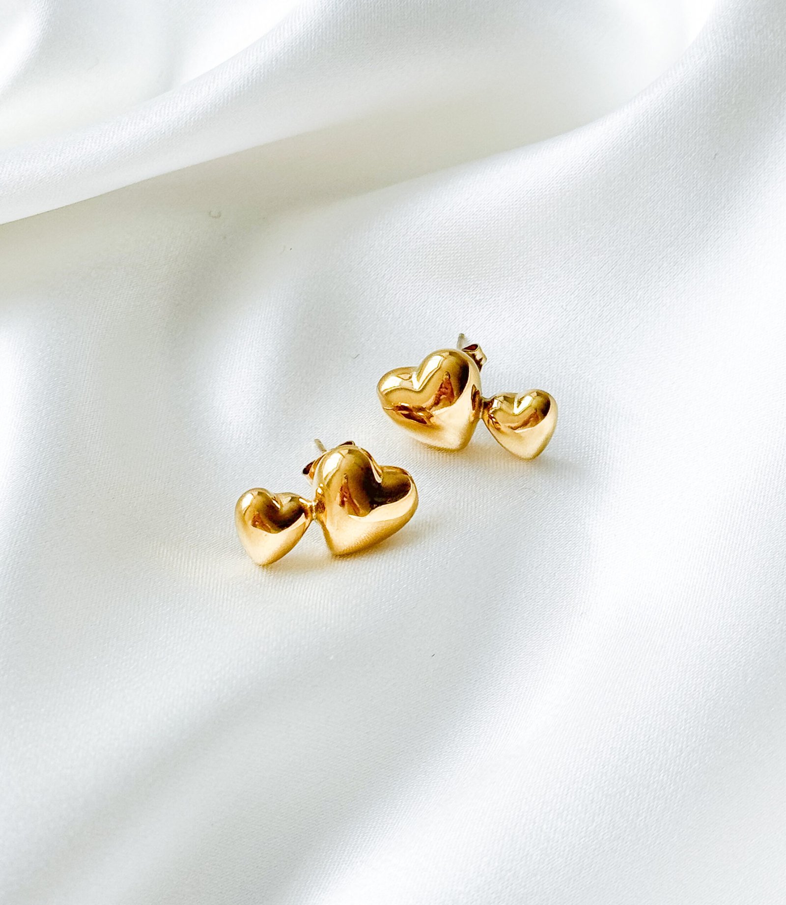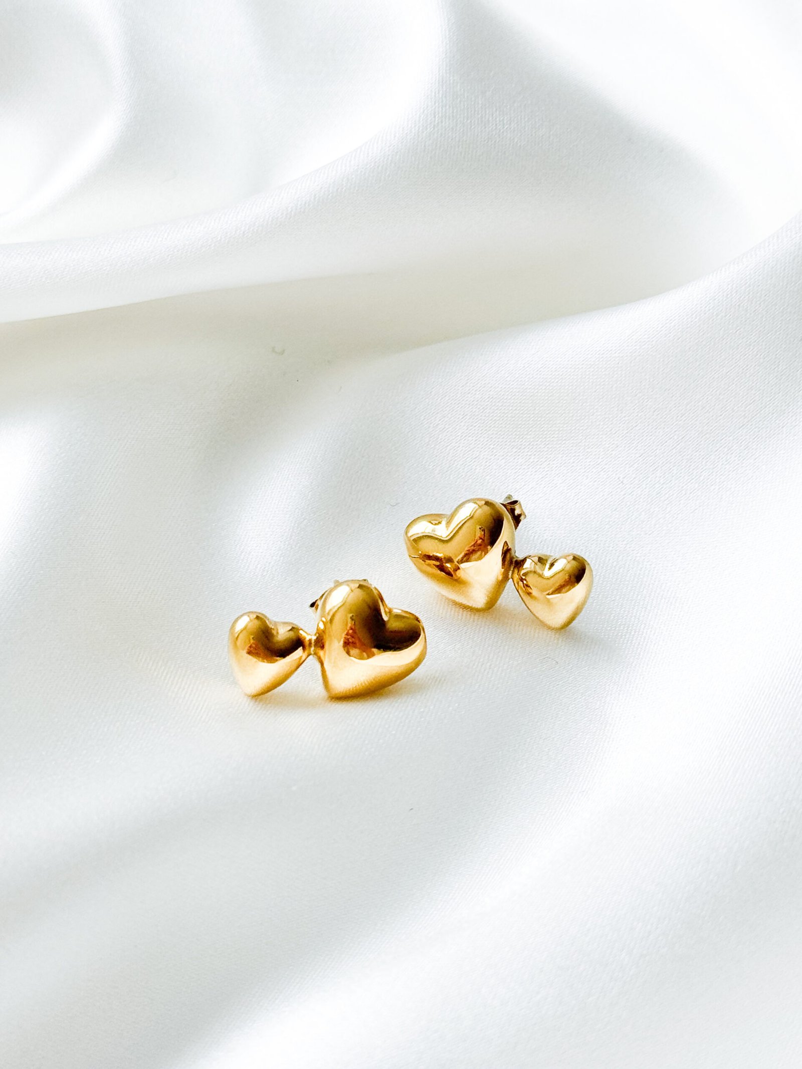 Aukso spalvos dvigubos širdelės formos auskarai iš nerūdijančio plieno.