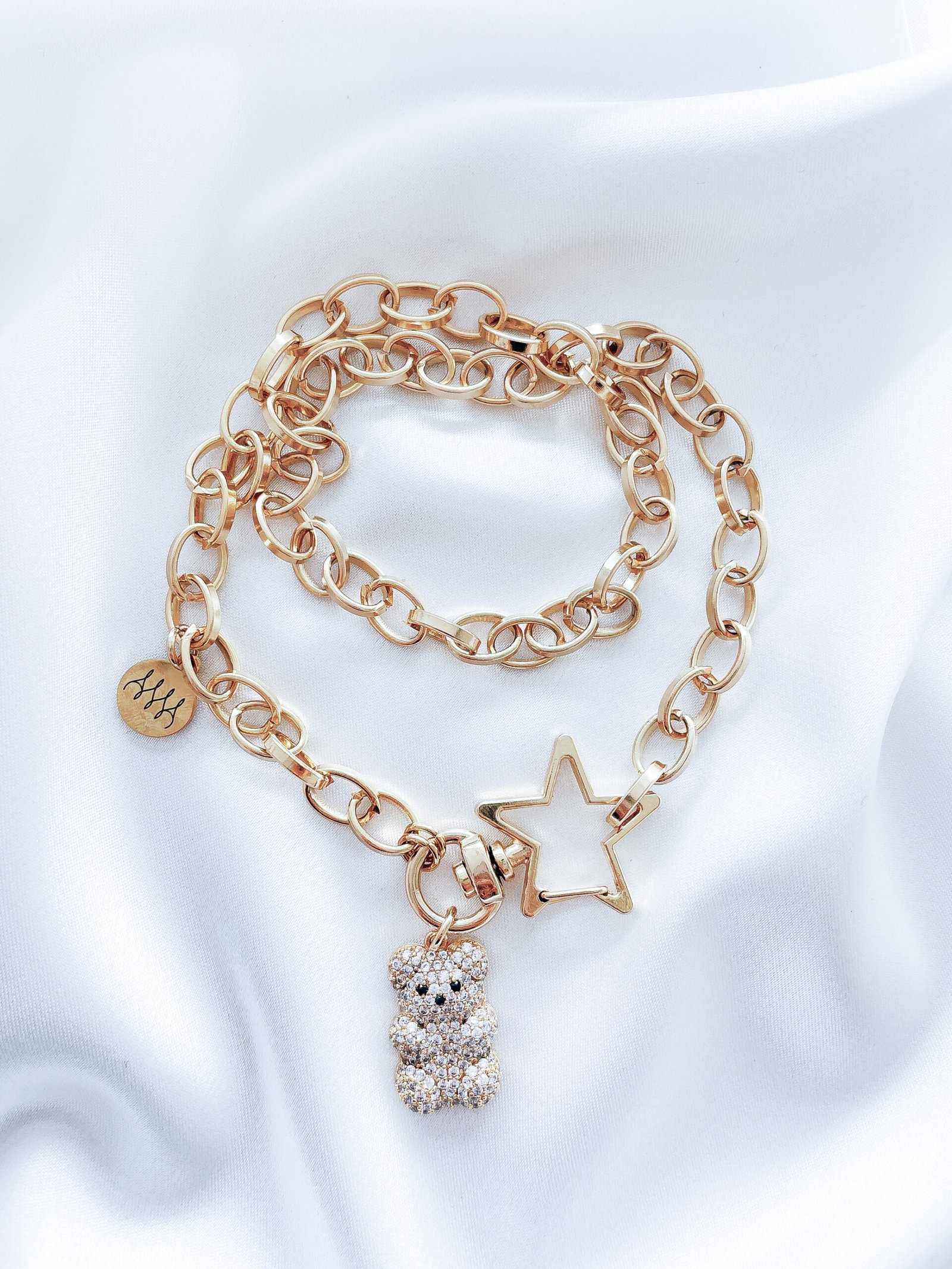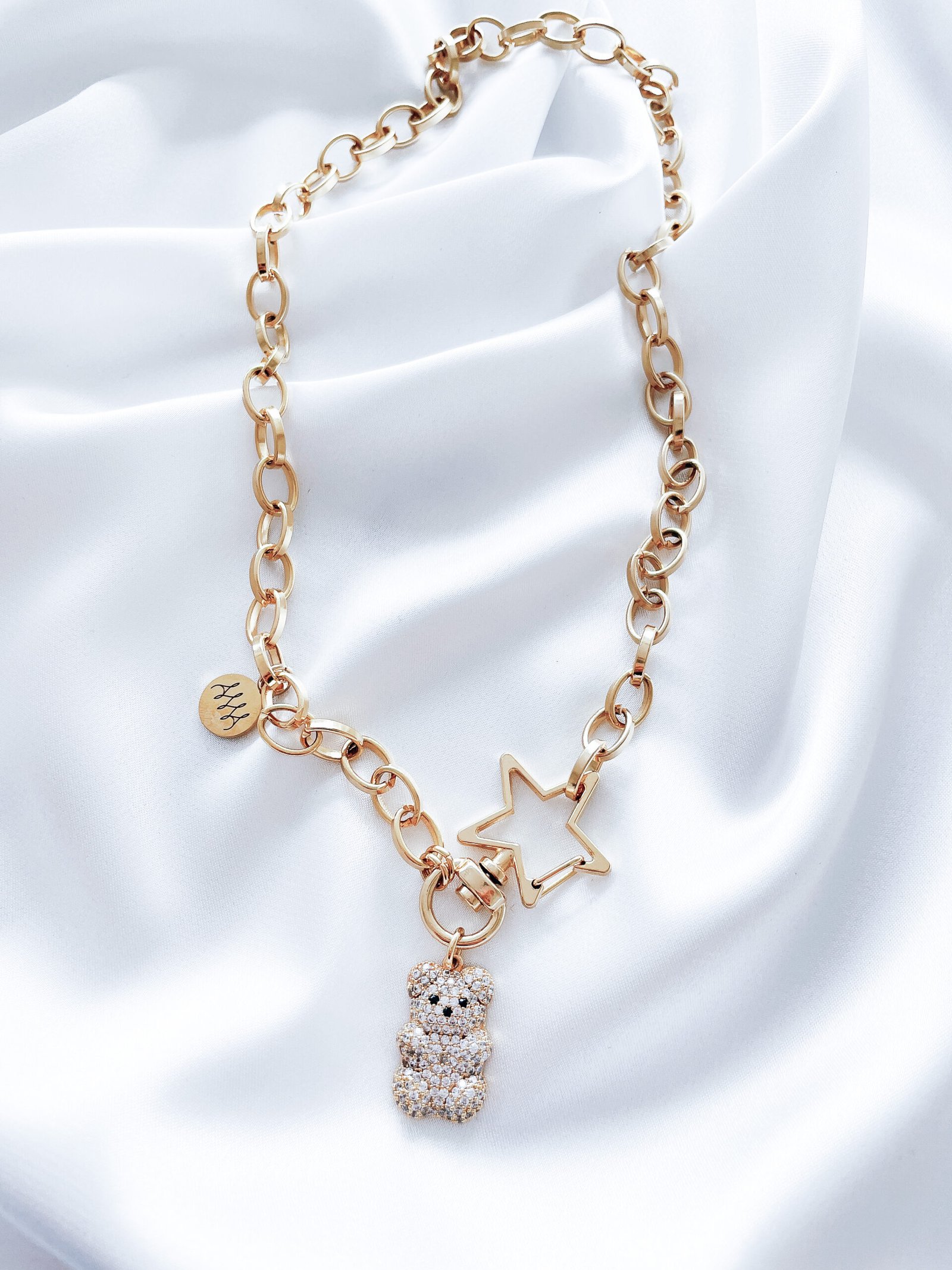 24k paauksuota grandinėlė, dekoruota žvaigždutės formos karabinu ir cirkonio akučių meškučiu, tinkanti tiek kasdieniam, tiek šventiniam įvaizdžiui.