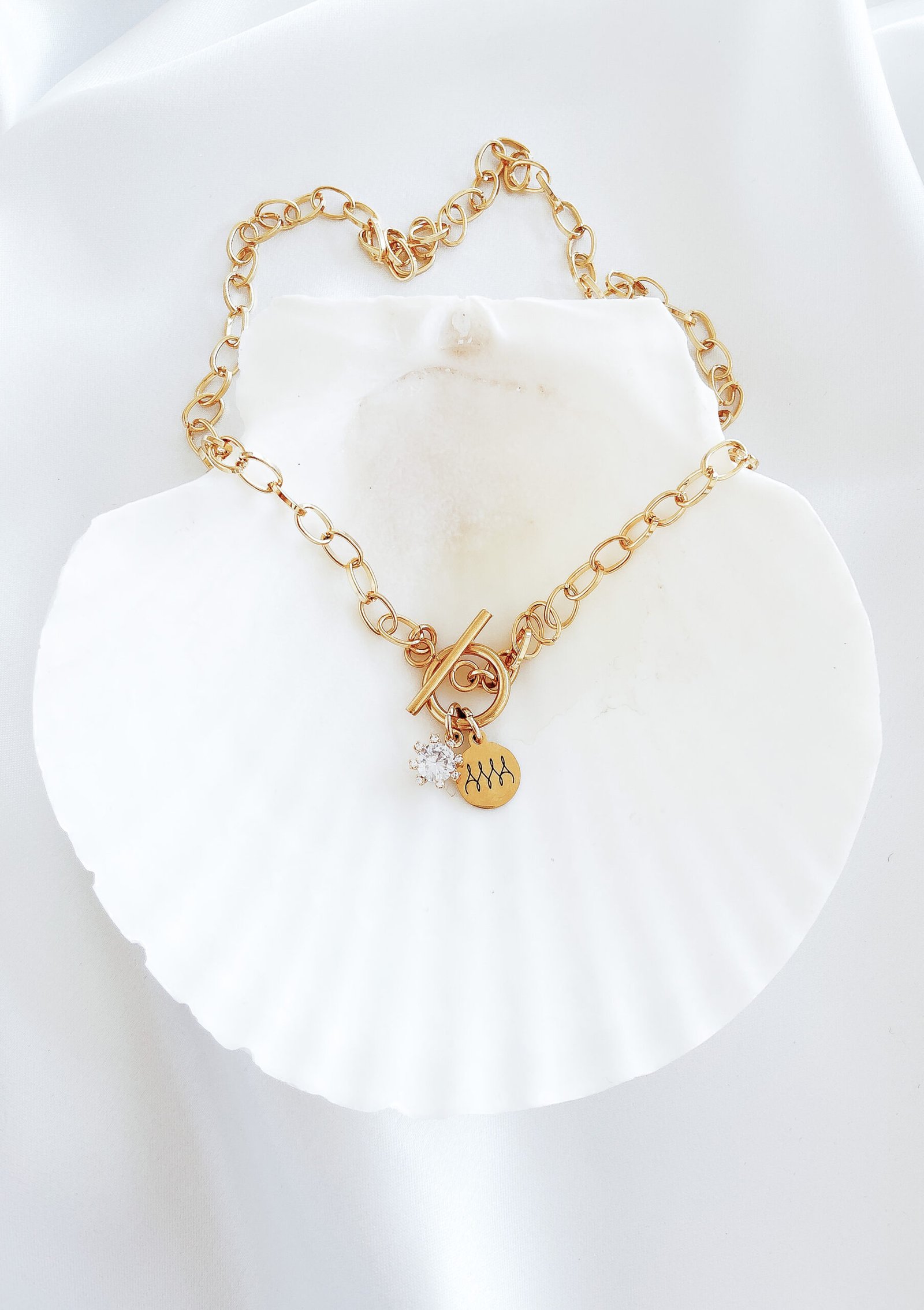 Stilinga ir minimalistinė 24k paauksuota grandinėlė, dekoruota cirkonio kristalu.