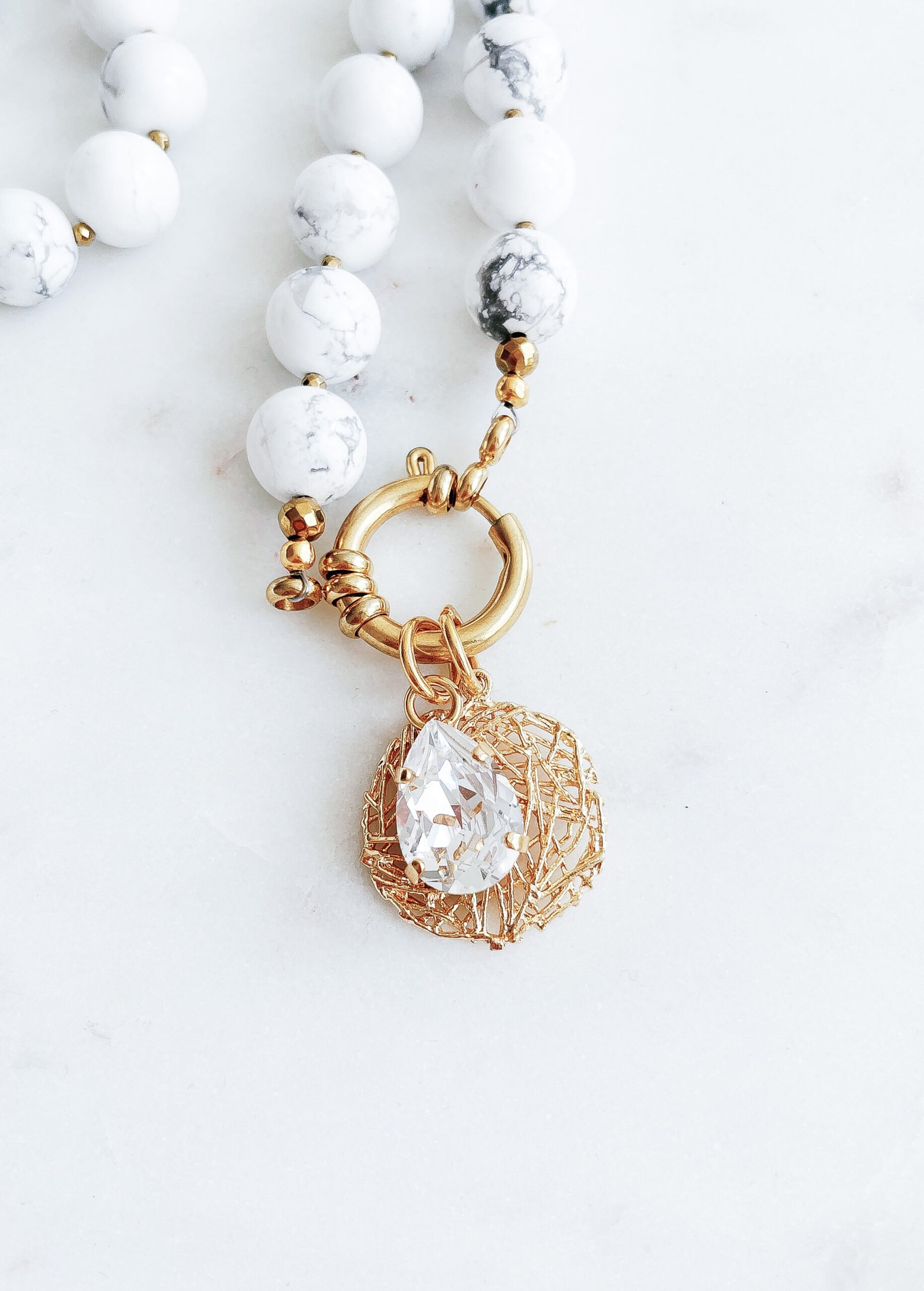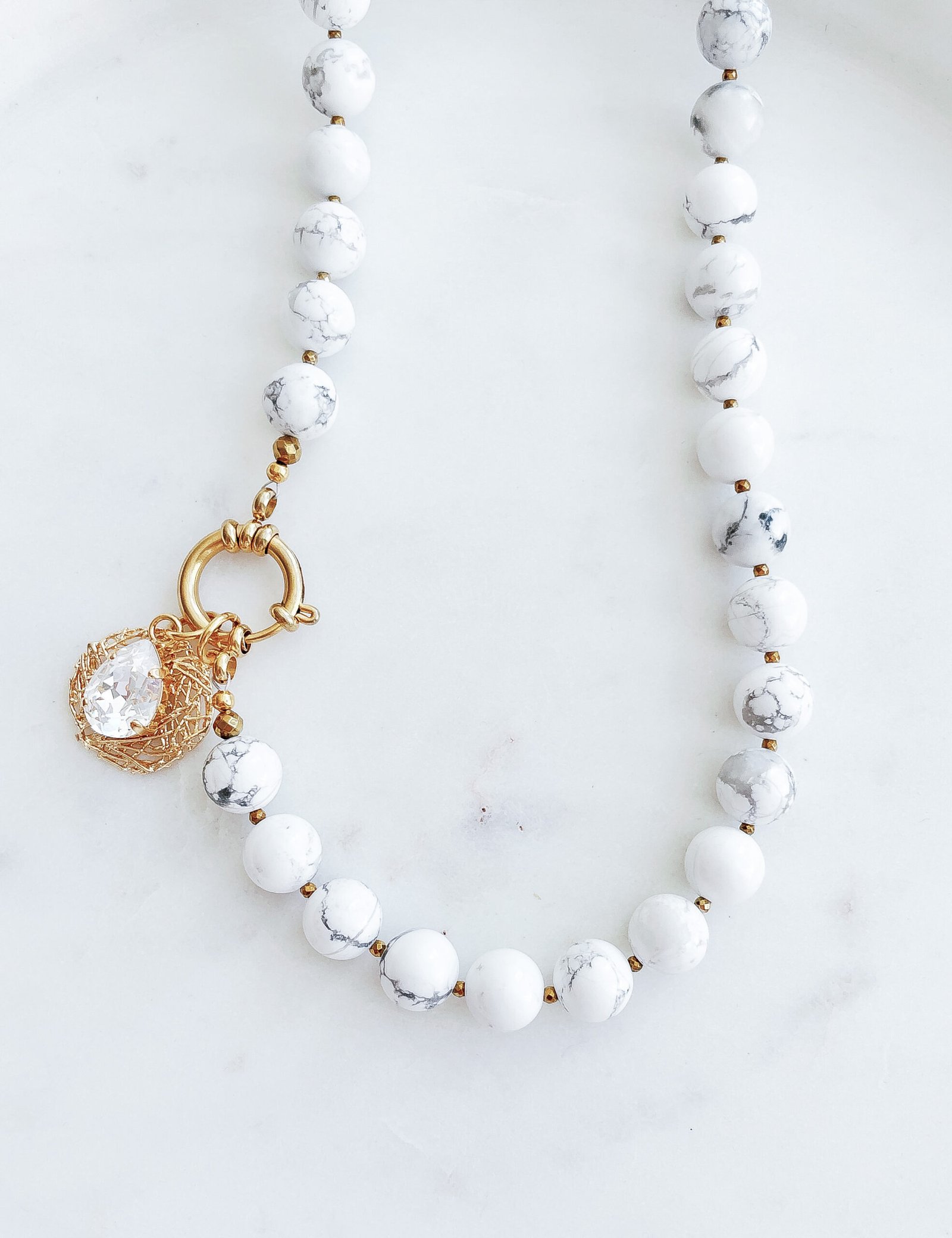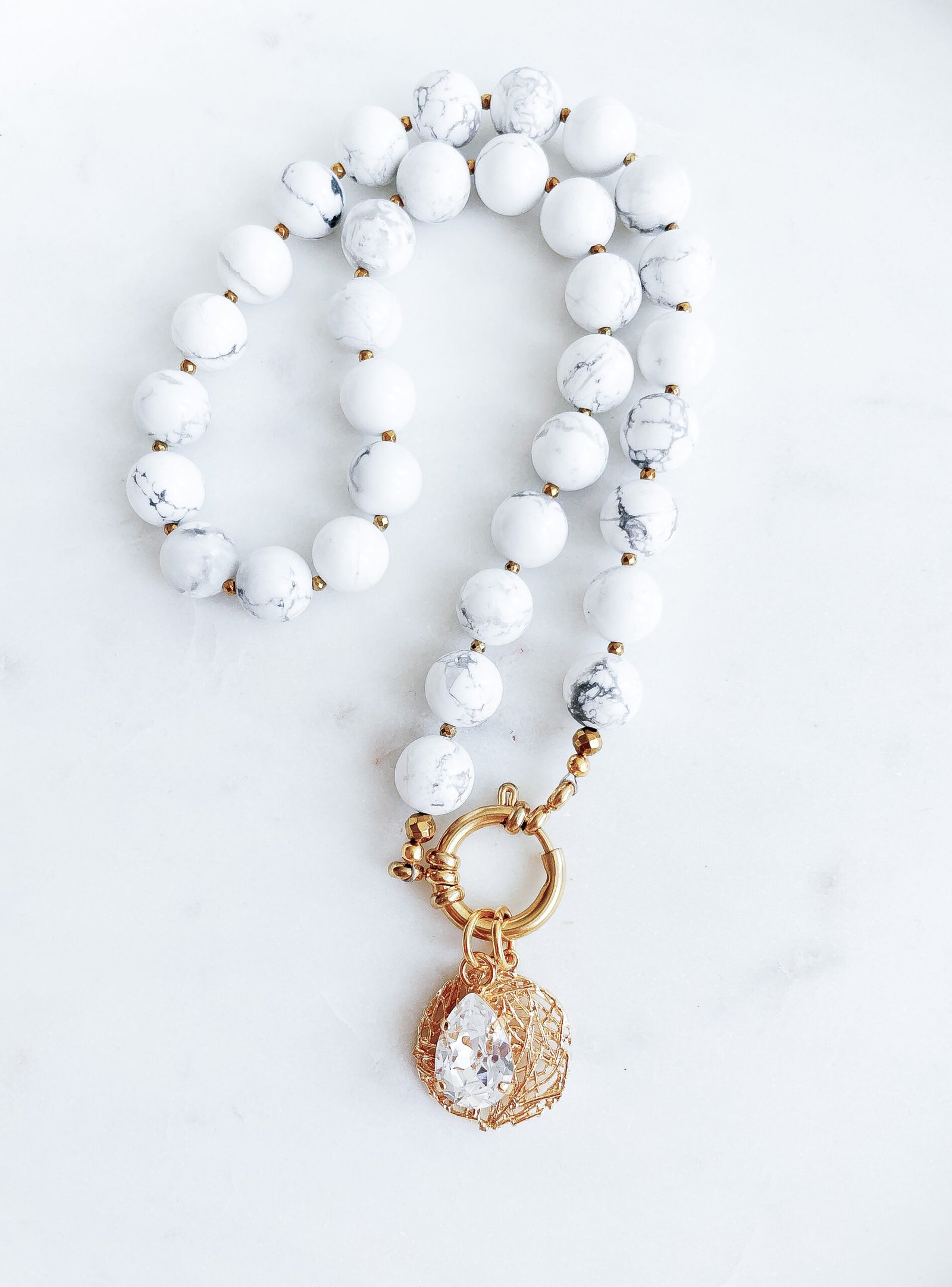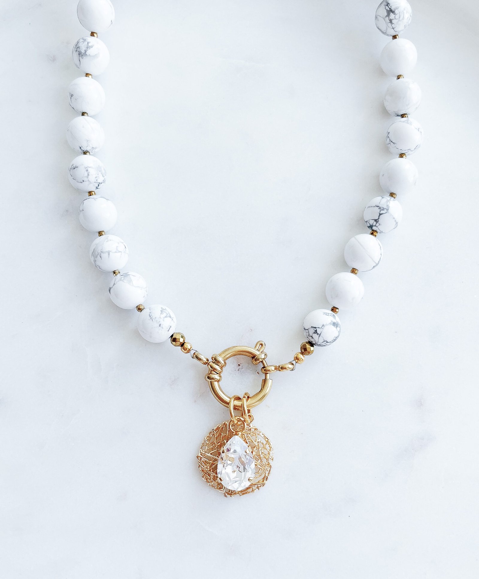 Žavingas hovlito akmens vėrinys, dekoruotas smulkiais hematito akmenėliais ir 24k paauksuotu žalvario medalionu bei swarovski kristalu.