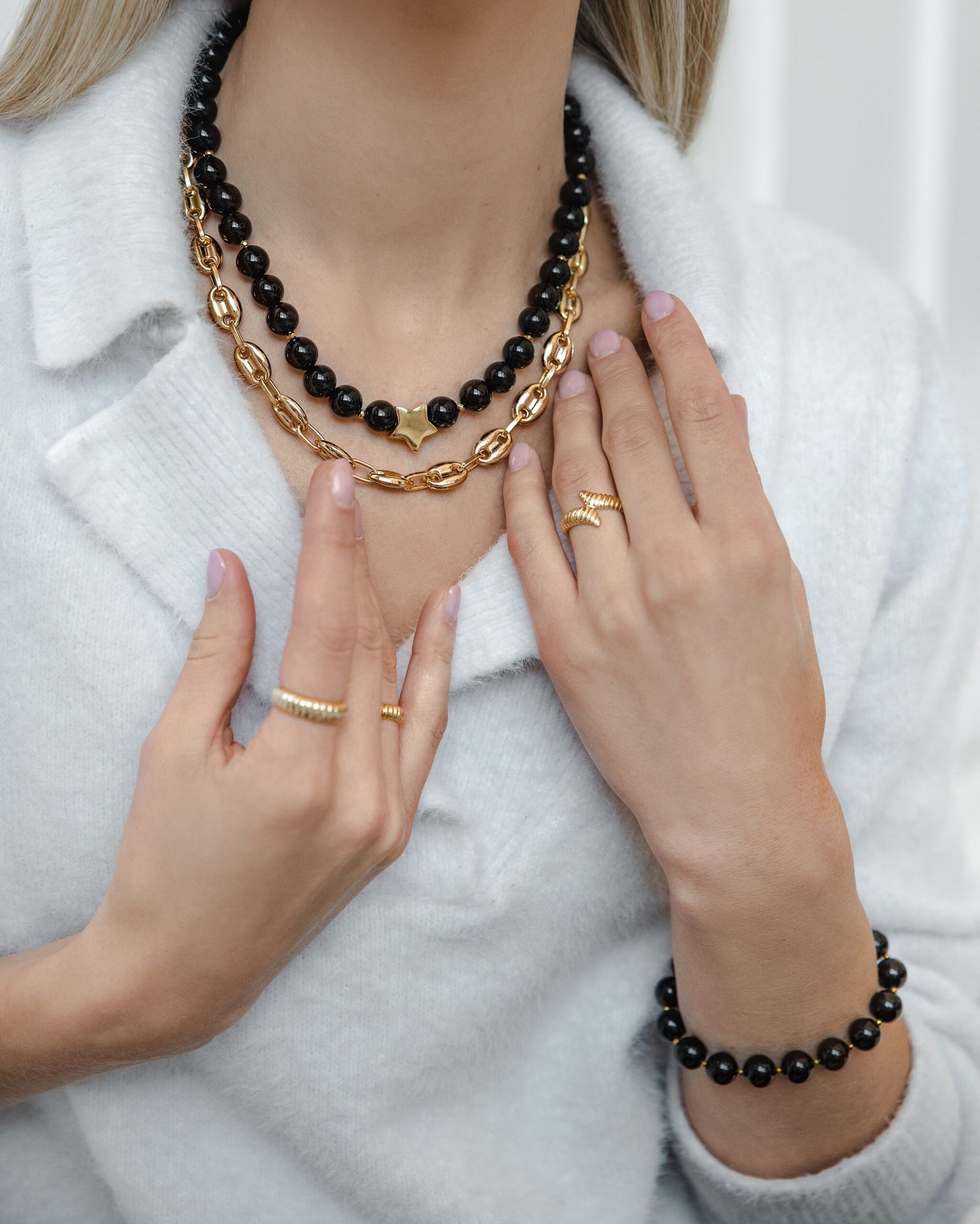Šis elegantiškas juodos spalvos onikso vėrinys – išskirtinis papuošalas, spinduliuojantis subtilią prabangą ir stiprybę. Blizgūs onikso karoliukai harmoningai dera su smulkiais hematito akmenėliais ir išskirtiniu žvaigždės formos pakabuku. Oniksas nuo seno laikomas apsaugos ir vidinės stiprybės akmeniu, todėl šis vėrinys ne tik puošia, bet ir turi simbolinę reikšmę. Puikiai tinka tiek kasdieniam stiliui pagyvinti, tiek elegantiškoms progoms.