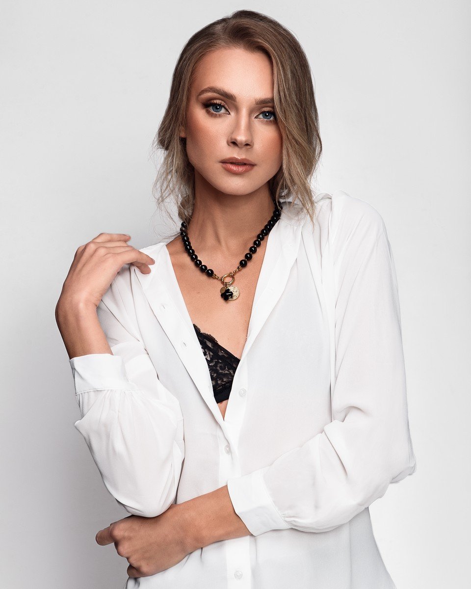 Žavingas juodo onikso akmens vėrinys, dekoruotas hematito akmenėliais ir 24k auksu dengtu žalvario pakabuku bei swarovski kristalu.