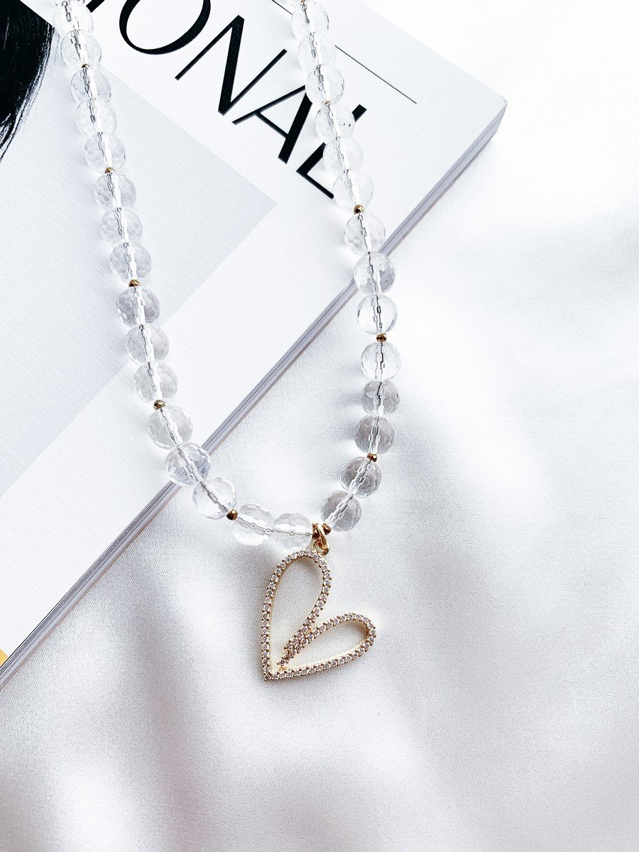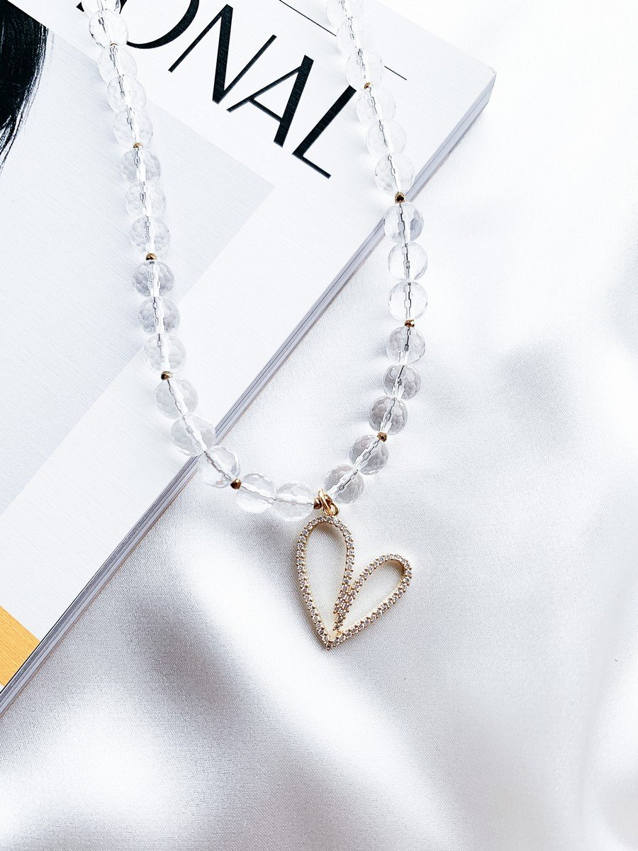 Stilingas skaidraus kvarco vėrinys, dekoruotas smulkiais hematito akmenėliais ir cirkonio akučių širdele.