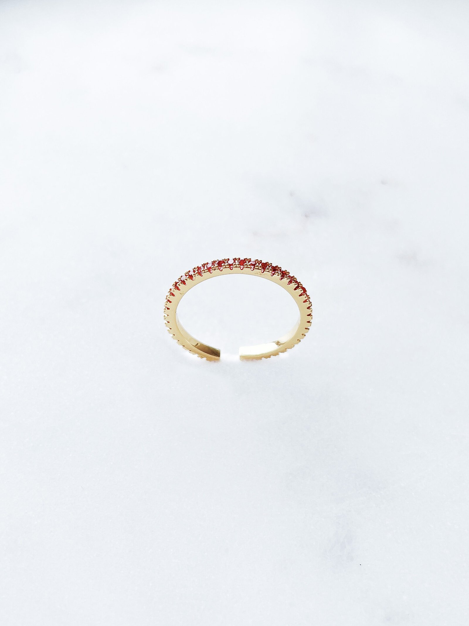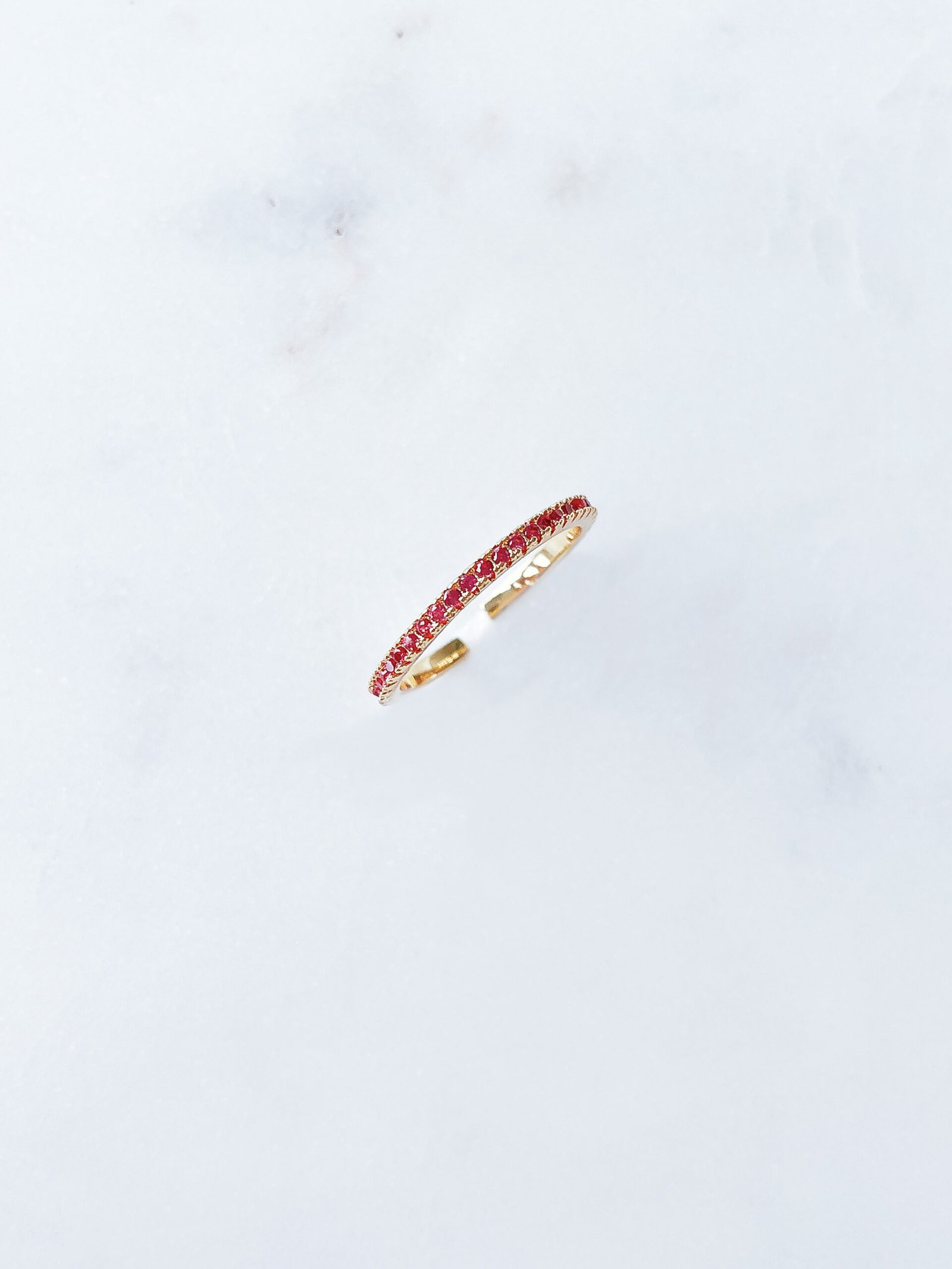 Minimalistinis žiedelis su rožinės spalvos cirkonio akutėmis, dengtas 24k auksu neliks nepastebėtas.