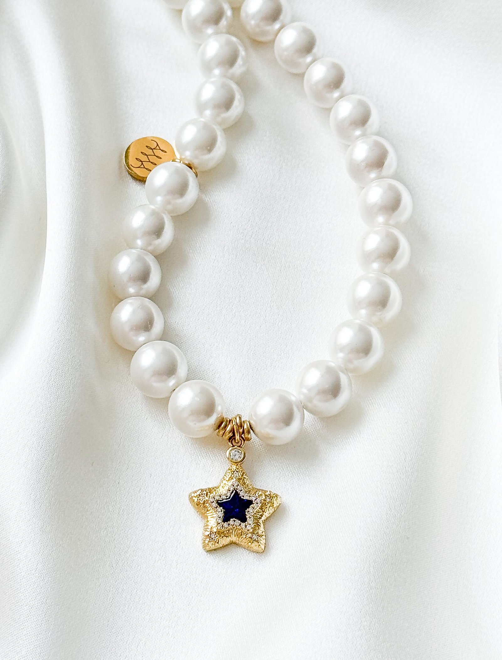 Baltos spalvos perlų masės vėrinys, dekoruotas žvaigždutės formos pakabuku su cirkonio akutėmis.