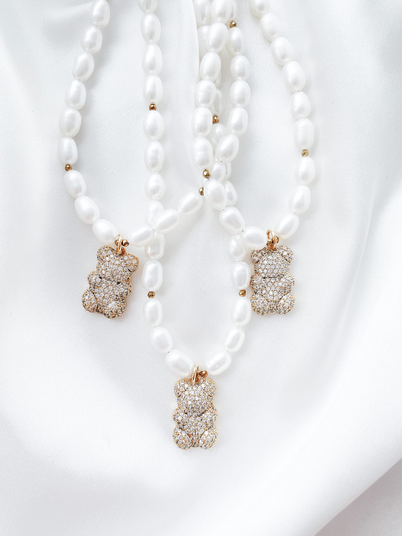 Žavingas upinių perlų vėrinys, dekoruotas smulkiais hematito akmenėliais su cirkonio akučių meškučiu.
