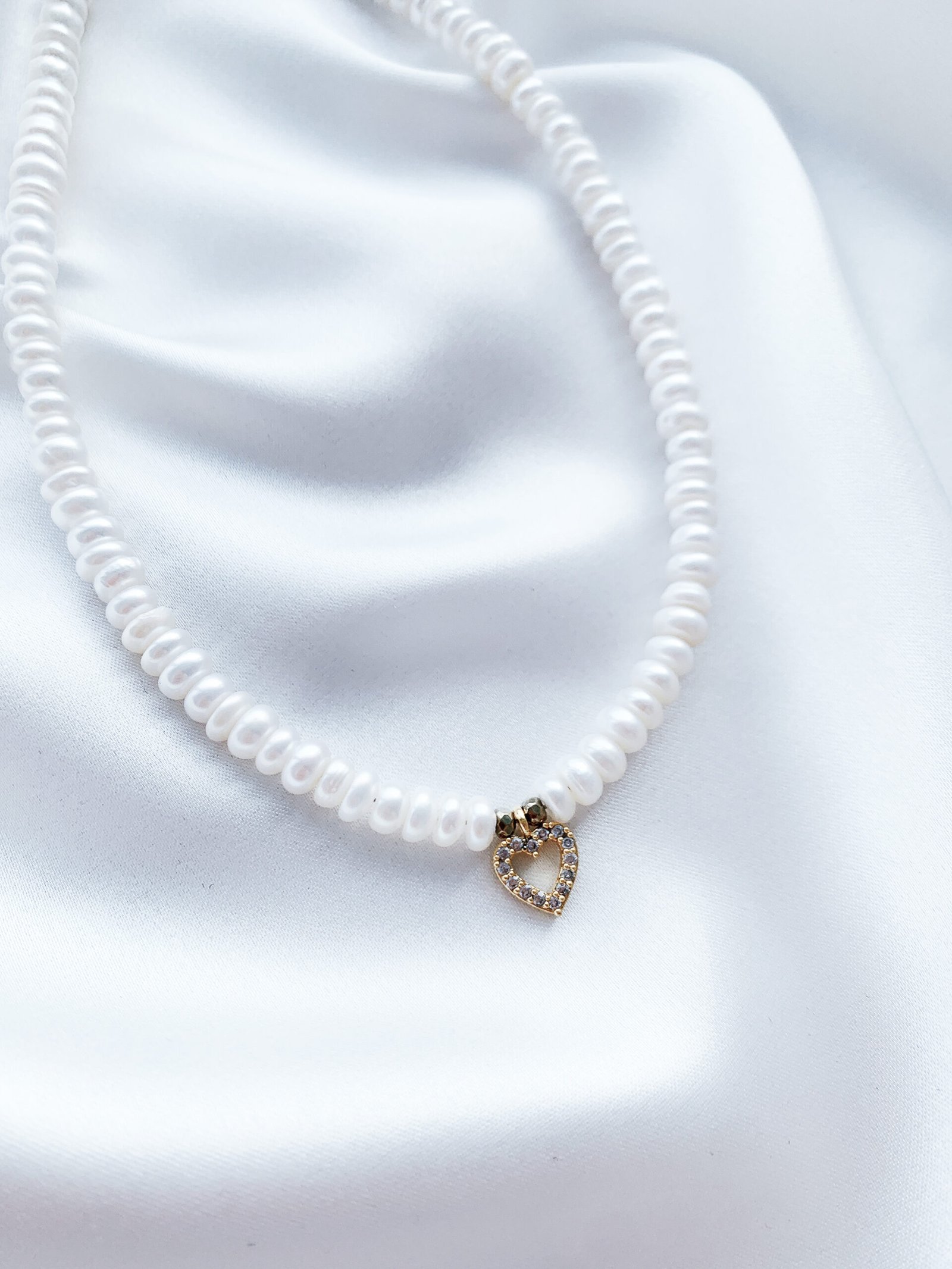 Stilingas ir minimalistinis pusiau apvalių upinių perliukų vėrinys su 24k auksu dengta širdele ir cirkonio akutėmis.