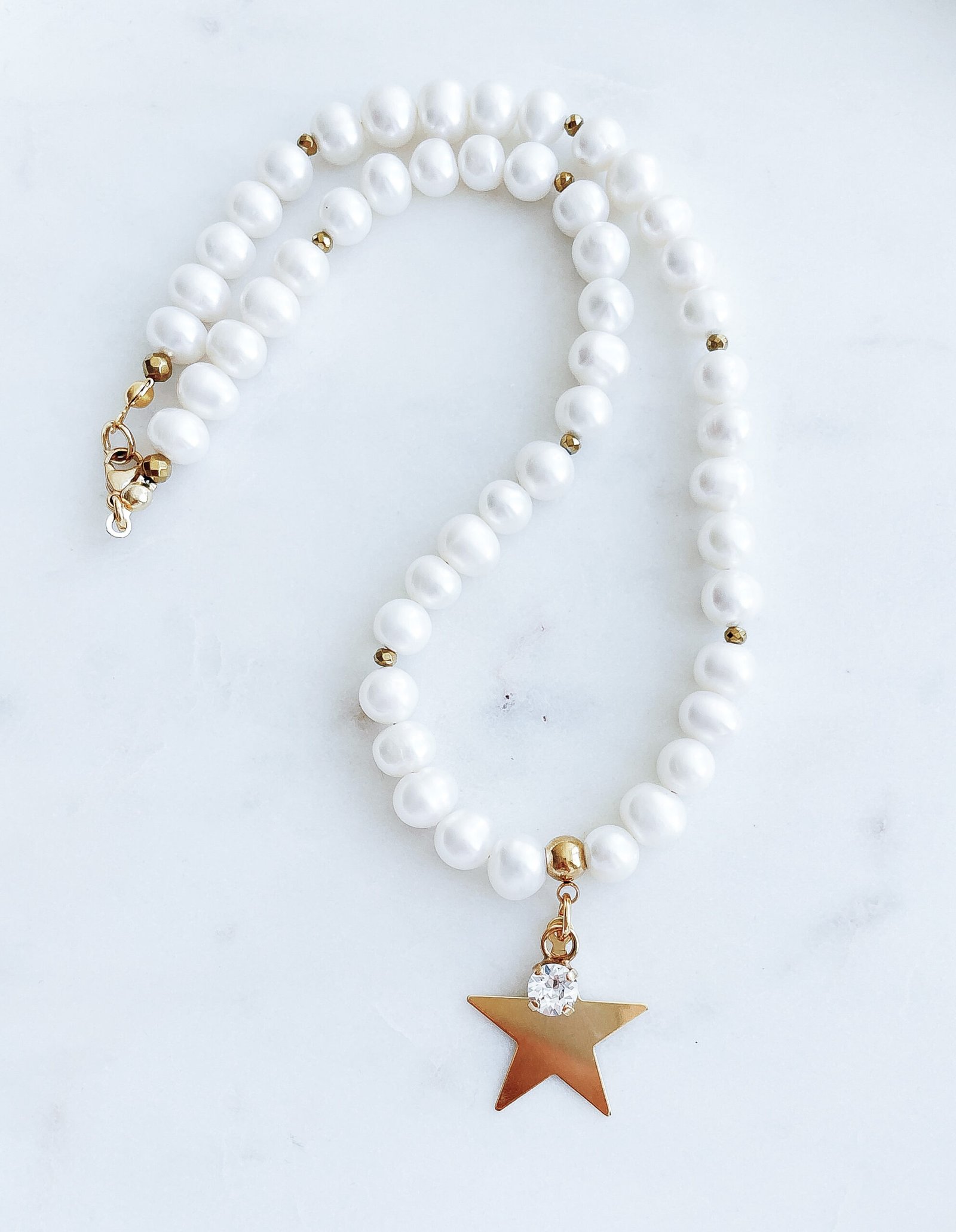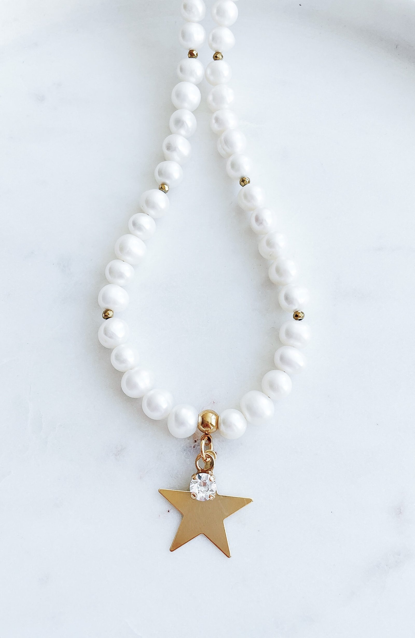 Lengvai derinamas upinių perliukų vėrinys, dekoruotas smulkiais hematito akmenėliais ir 24k paauksuota žvaigždute ir swarovski kristaliuku.