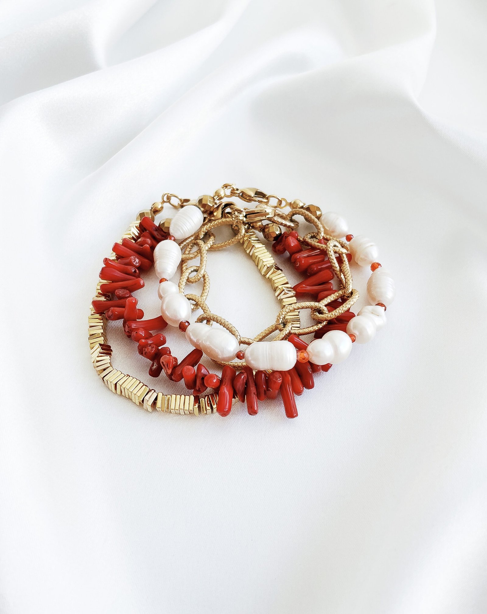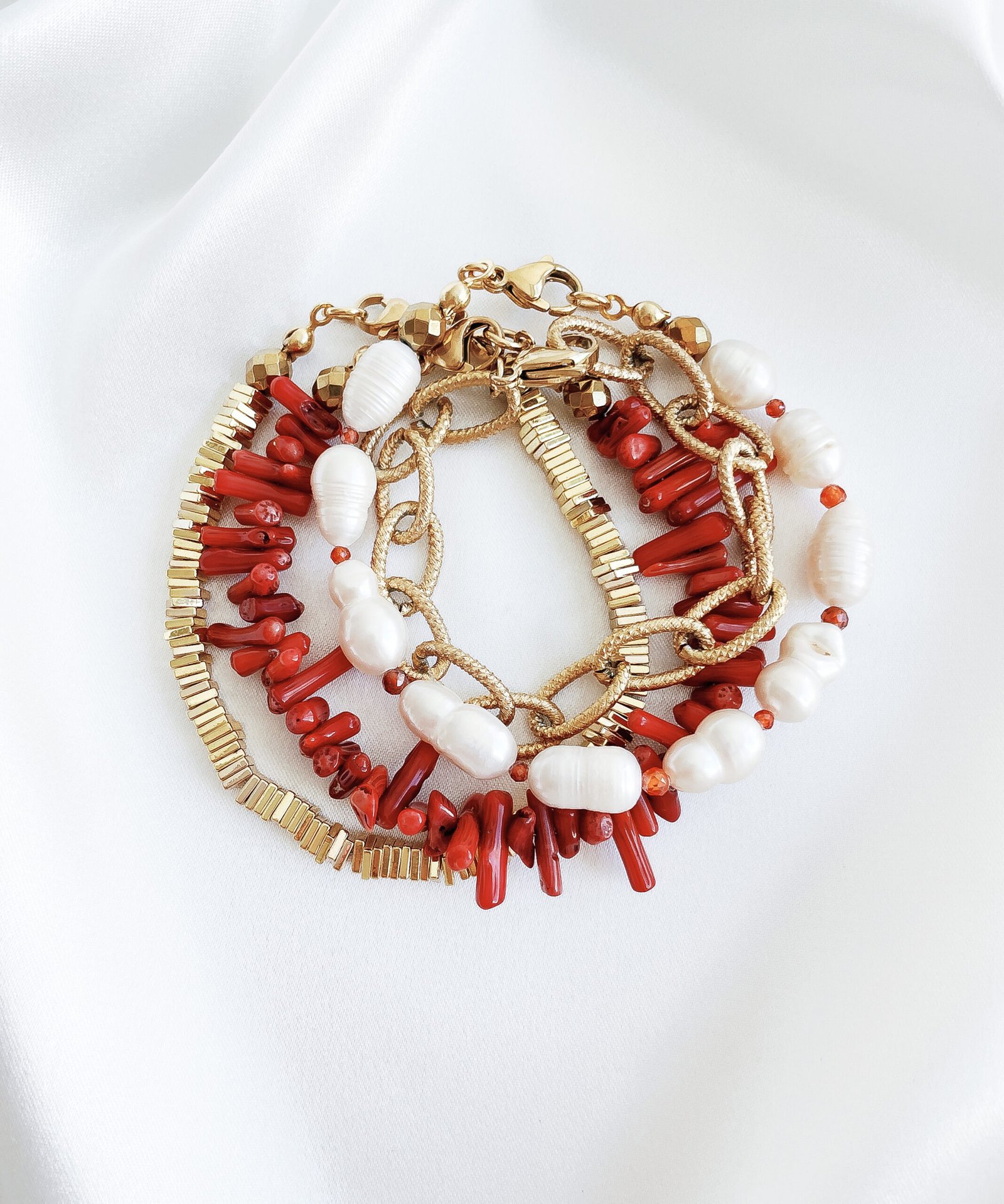 Raudonų atspalvių apyrankė, kurią itin lengva derinti prie vasariškų drabužių derinių. Apyrankė sudaryta iš keturių atskirų apyrankių, kurias galima dėvėti visas kartu arba atskirai.