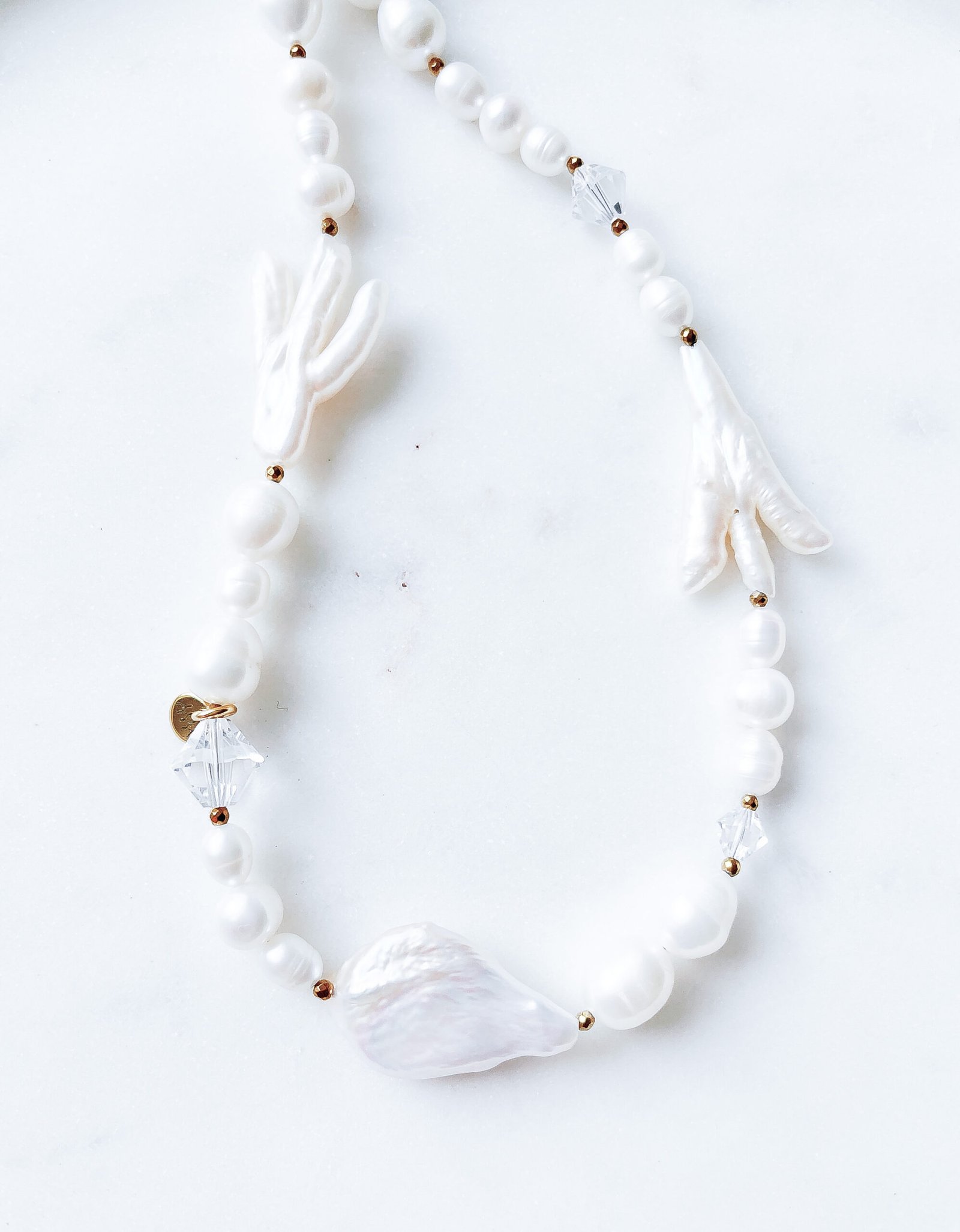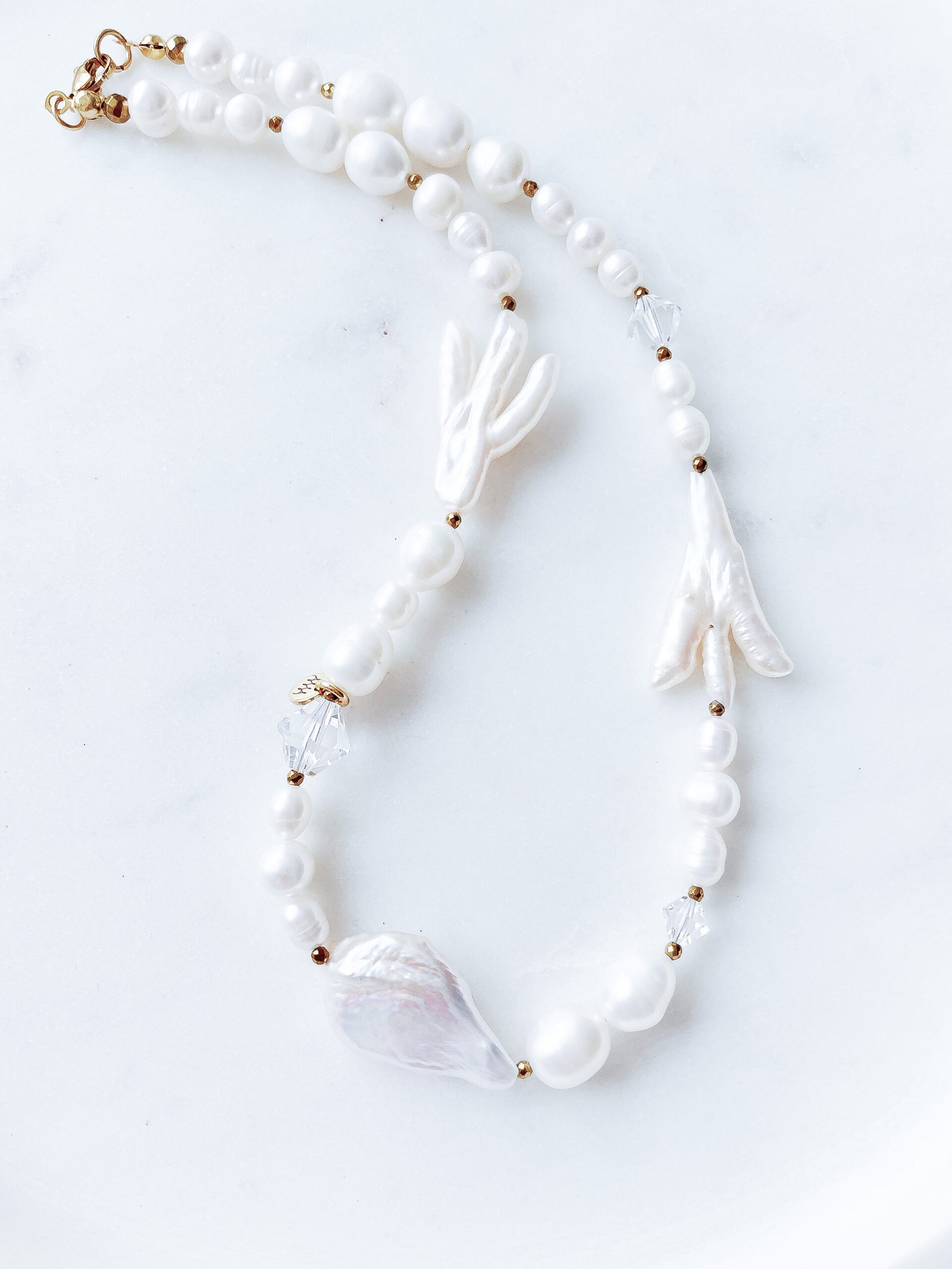 Sudėtis: upiniai perlai, vištų kojelių formos perlai, hematitas, swarovski karoliukai, barokinis perlas.