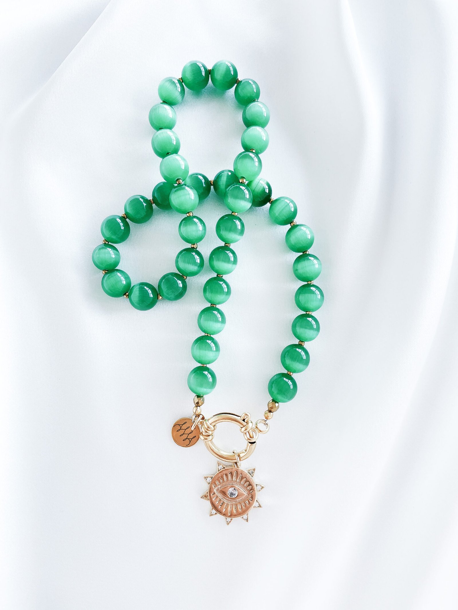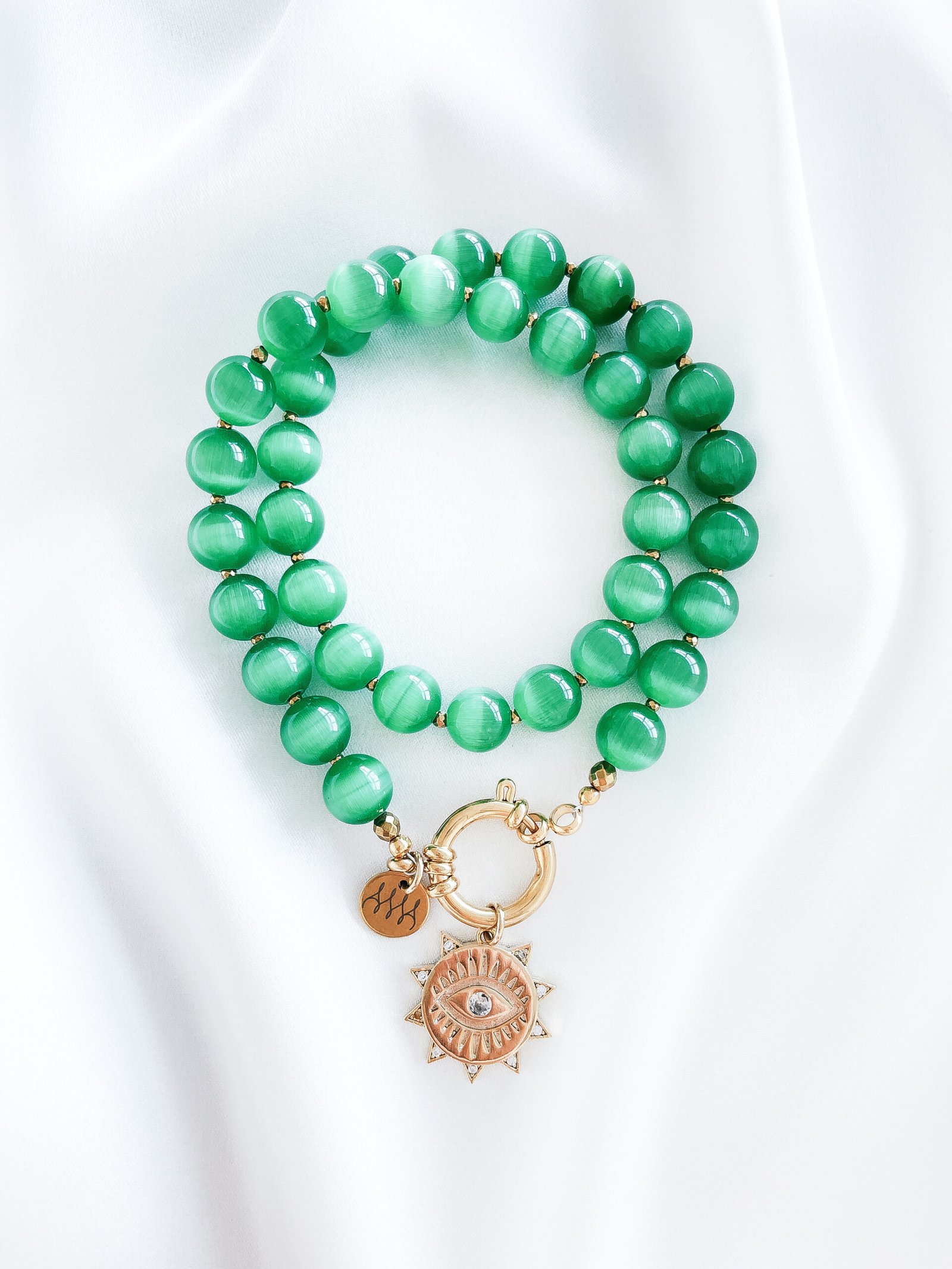 Žavingas katės akies vėrinys, dekoruotas hematito akmenėliais ir 24k paauksuotu žalvario medalionu su cirkonio akutėmis.