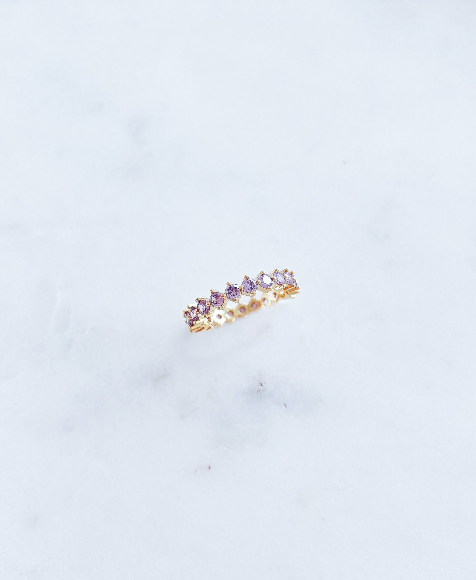 24k paauksuotas žiedas su šviesios violetinės spalvos cirkonio akutėmis, tinkantis tiek kasdieniam, tiek šventiniam įvaizdžiui.